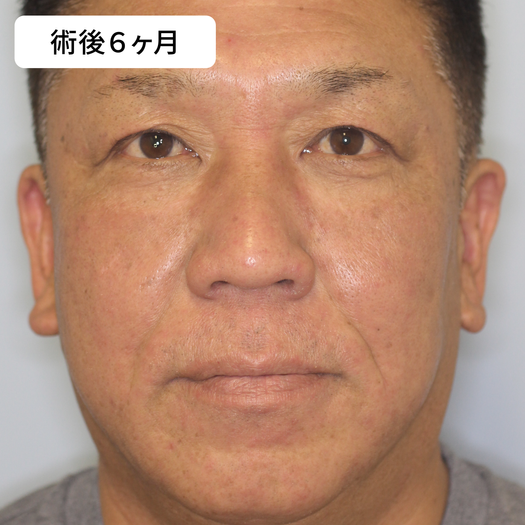 50代の方ですので、経結膜的眼窩脂肪移動術で目袋の修正を行い、ミッドフェイスリフトで中顔面の挙上、レーザーリサーフェシングで肌の引き締めを行いました。男性ですが、フルコースで行いました。写真は、術前、術後6ヵ月です。